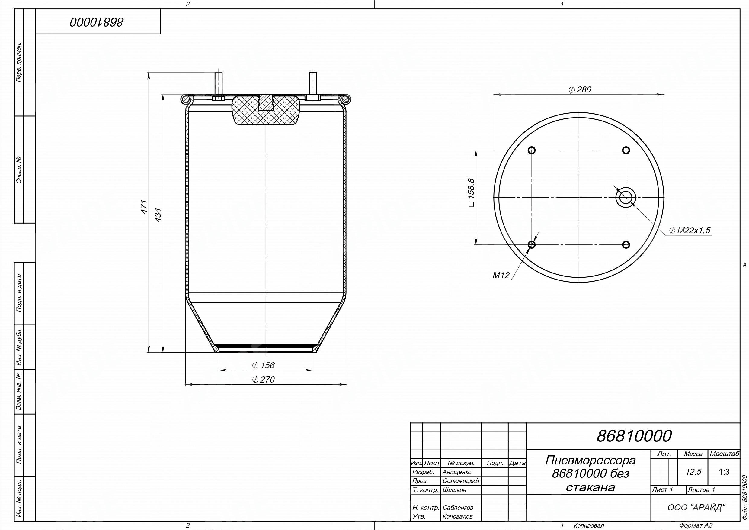 Пневмоподушка без стакана. 4 шпильки M12. 1 отверстие M22х1.5.