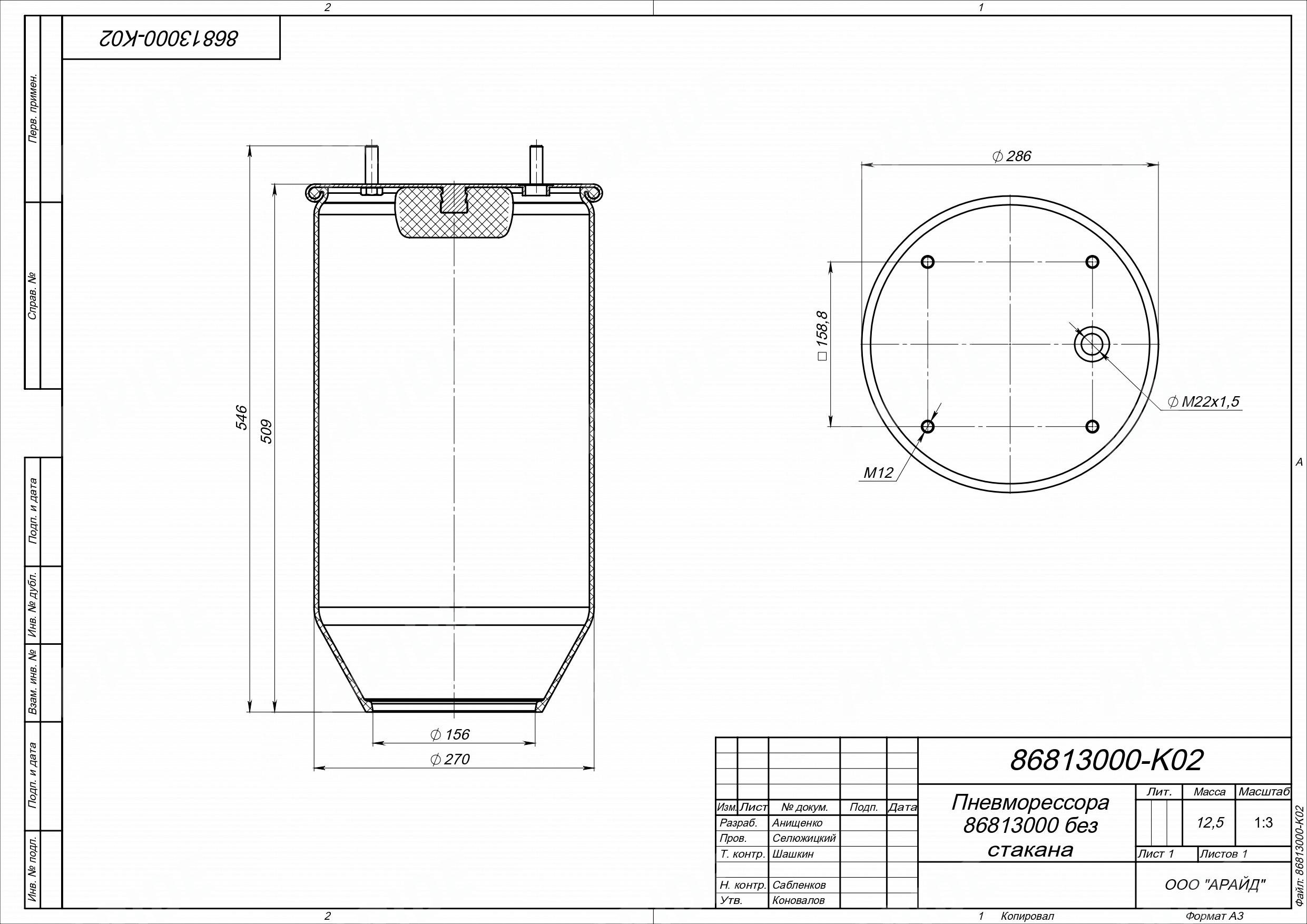 Пневмоподушка без стакана. 4 шпильки M12. 1 отверстие M22х1.5
